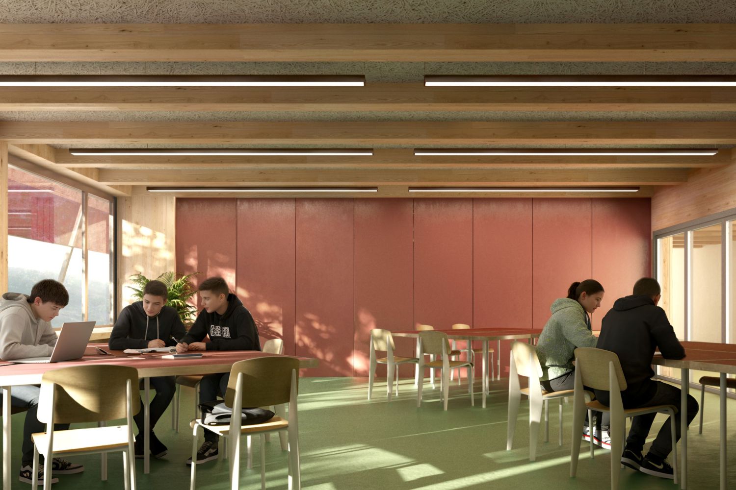Die Erweiterung erfolgt in modularer Holzsystembauweise mit hohem Vorfertigungsgrad, kurzer Bauzeit und geringen Emissionen. Das gewählte Tragsystem ermöglicht es, das Gebäude Ebnet 1 mit geringem baulichem Aufwand an heutige Anforderungen anzupassen, wobei die bestehende Aula unangetastet bleibt. Die Treppenhäuser werden als sichere Fluchtwege ausgebildet, sodass Foyers und Korridore frei von brandschutzbedingten Einschränkungen flexibel möbliert und vielfältig genutzt werden können.