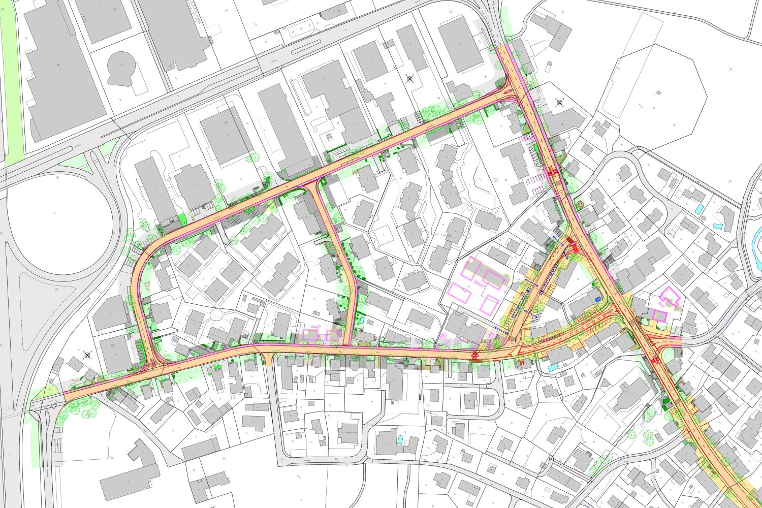 Aus betrieblicher Sicht wurden grundlegende Verkehrsströme und Strassenquerschnitte hinterfragt. Zudem wurden alternative Platzierungen und der Ausbau von Fussgängerquerungsstellen geprüft, Anpassungen der Knotengeometrien untersucht sowie Varianten zum Ausbau der drei Bushaltestellen oder zu einem Bushof diskutiert. Parallel dazu wurden gestalterische Aufwertungsmöglichkeiten wie unterschiedliche Oberflächenmaterialisierungen und Begrünungskonzepte evaluiert.