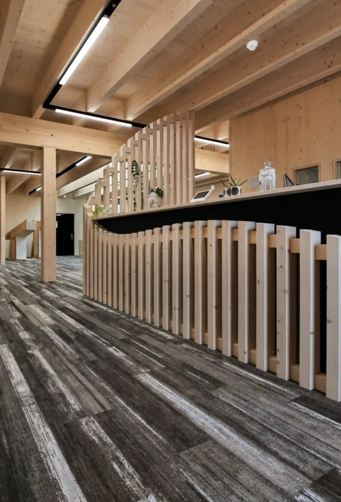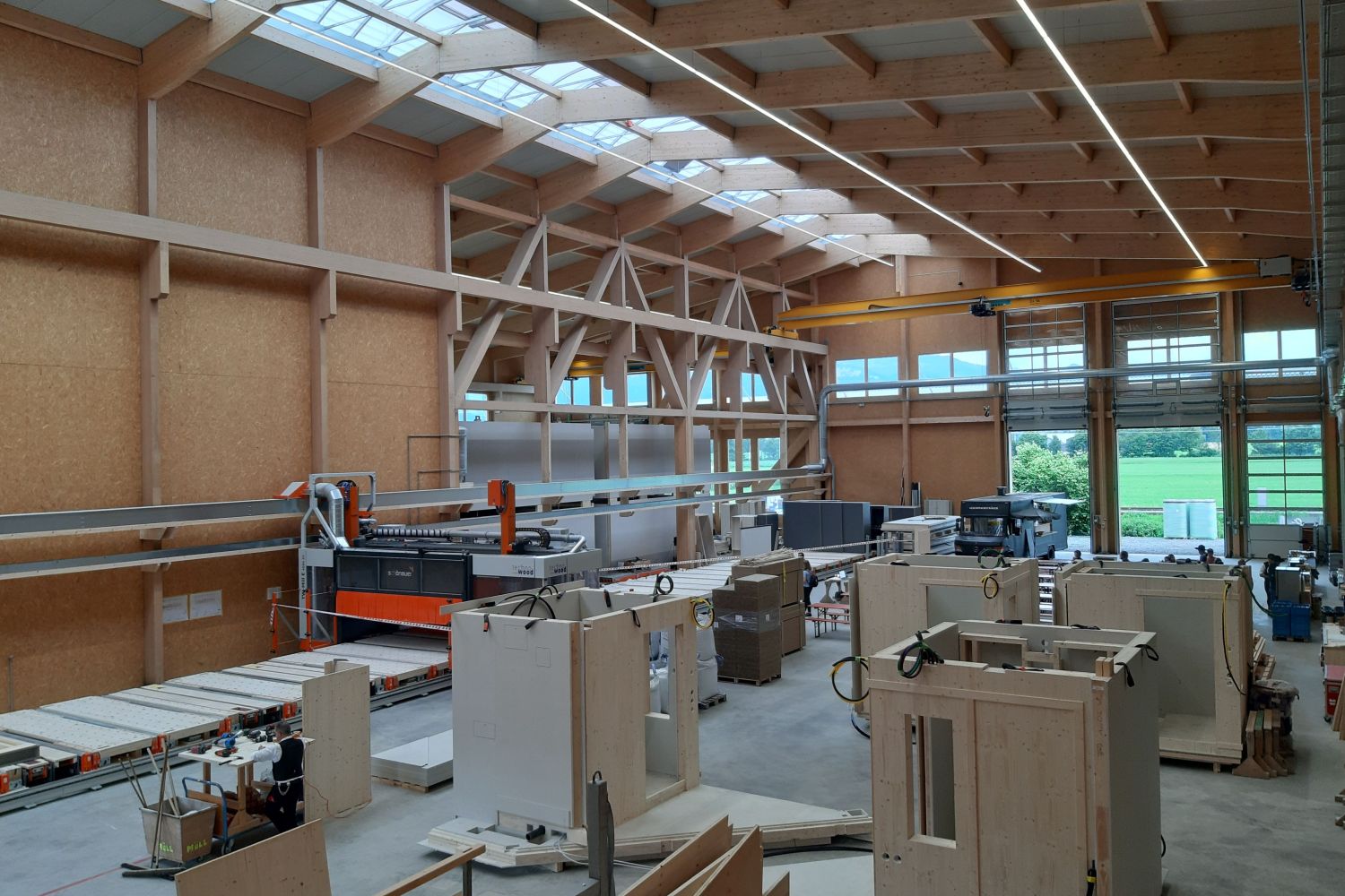 Die neue Produktionshalle der Schönauer AG in Marbach kombiniert Lager, Fertigung und Verwaltung in einem durchdachten Ensemble. Drei Hallenschiffe bilden das Herzstück: Technik- und Lagerräume, eine Portal-Bearbeitungsanlage sowie die Modulproduktion. Ergänzt wird die Halle durch einen Kopfbau mit drei Geschossen, der Büroflächen und einen Ausstellungsbereich beherbergt. Für den effizienten Materialfluss sorgen zwei Kranbrücken pro Hallenschiff, die Module bis 20 Tonnen bewegen können. Die Tragkonstruktion aus Fichten-Brettschichtholz und Baubuche ermöglicht schlanke Bauteile und grosszügige Nutzflächen. Ein Fachwerk aus Baubuche verbindet die Hallenschiffe und übernimmt die Lasten der Dachkonstruktion sowie der Krananlagen. Im Bürobereich kommt eine sichtbare Holz-Beton-Verbunddecke zum Einsatz, deren Vorfertigung eine Unterspriessung während des Betonierens überflüssig machte, ein klarer Vorteil für Bauzeit und Effizienz. Nachhaltigkeit spielt ebenfalls eine zentrale Rolle: Restholz aus der Produktion wird in einem 200 m³ grossen Holzsilo gelagert und dient als Energiequelle für die Heizung. So vereint das Projekt moderne Produktionsprozesse mit ressourcenschonender Bauweise.