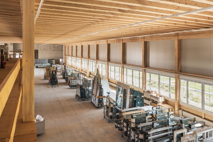 Im Erdgeschoss der imposanten Gewerbe-Holzbaute im Münchwiler Murgtal findet eine Produktions-, Lager und Logistikfläche zur Fensterproduktion ihren Platz. Pro Tag sollen dank hohem Automatisierungsgrad 50 bis 60 Fenster hergestellt werden. Das Obergeschoss wird als Lager und Bürofläche genutzt.