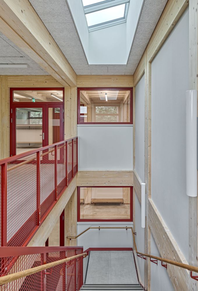 Aufgrund des effizienten Tragwerkskonzeptes mit einzelnen aussteifenden Wandscheiben aus Blockholzplatten und mitsamt Akustik im Werk vorgefertigten Deckenelementen, welche an Zwillingsstützen abgestützt sind, bleibt die Raumaufteilung sehr flexibel. Die minimalen Fluchtweg. bzw. Erschliessungsflächen ermöglichen eine flexible Nutzung der Kernzone.