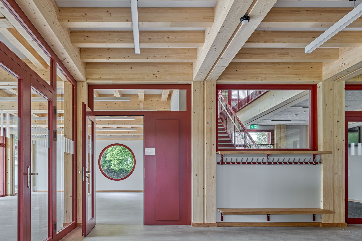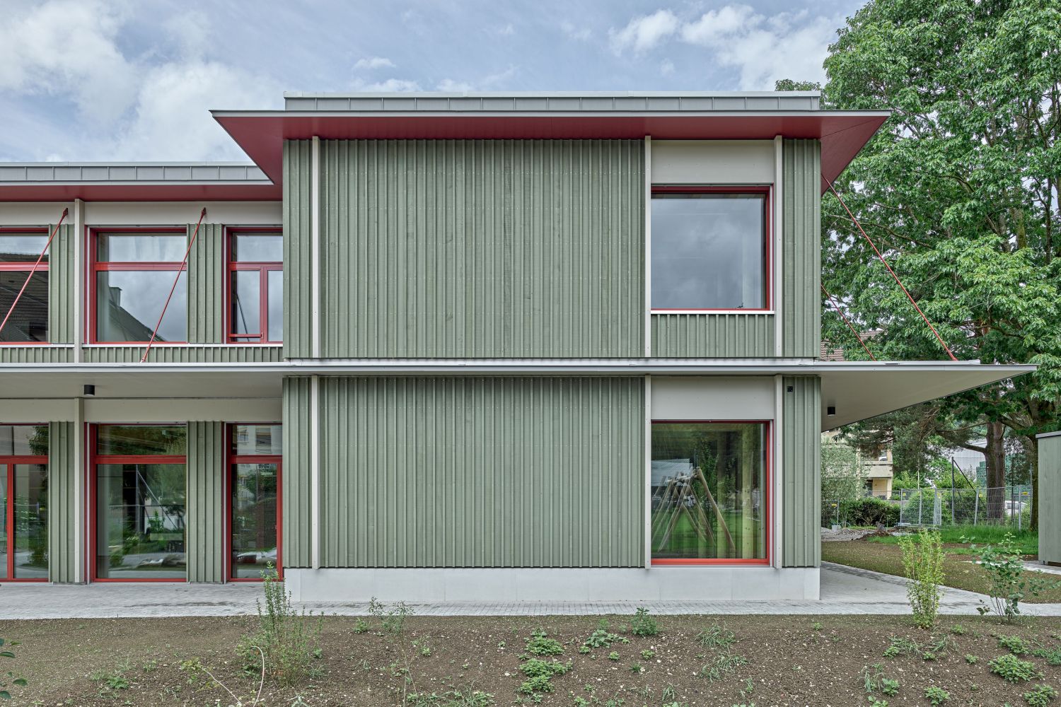 Neubau eines unterkellerten, zweigeschossigen Schulhauses mit Kindergarten in Holzbauweise, das zu einem späteren Zeitpunkt modular auf total vier Vollgeschosse aufgestockt werden kann.