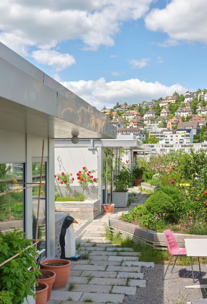 Im Fokus der Aufwertung standen die Gemeinschaftsbereiche im Erd- und Dachgeschoss von Haus A sowie die Aussenanlagen. Ein neues Mobilitätskonzept schuf zusätzliche Flächen im Erdgeschoss und verwandelte den Hof in einen autofreien Platz. Gemeinschaftsräume wie Waschsalon, Werkstätten und Gästezimmer wurden erweitert, der Dachraum vergrössert und die Dachterrasse in einen Garten mit Pergola umgestaltet. Die Fassaden erhielten neue Fensterlösungen, und die Planung erfolgte partizipativ – mit besonderem Augenmerk auf Barrierefreiheit und Ressourcenschonung.