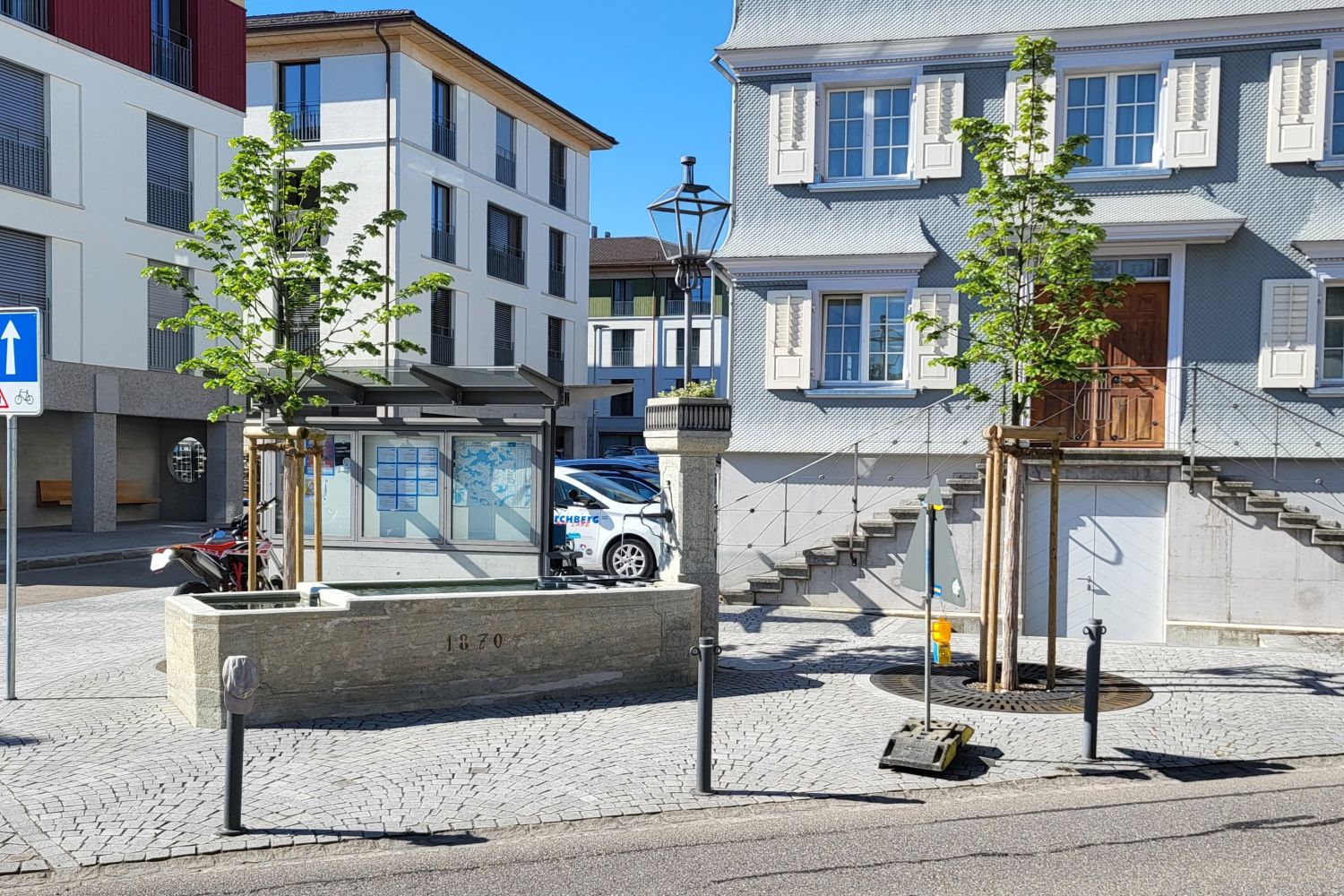 Die Fahrbahnhaltestelle wurde mit Waschbeton ausgeführt, die angrenzende Bogenpflästerung in gebundener und ungebundener Bauweise erstellt. Der rund 65 Meter lange Strassenabschnitt wurde landschaftlich aufgewertet: Ein bestehender Baum konnte erhalten werden, zwei neue Bäume ergänzen das Grünflächenangebot und tragen zur Verschönerung der Umgebung bei.