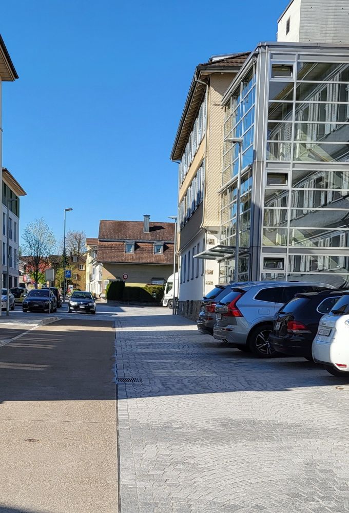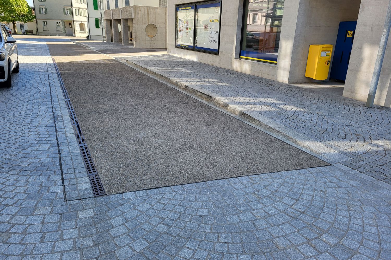 Im Bereich der Wegfahrt wurde ein bestehender Velounterstand gekürzt und ein Natursteinbrunnen verschoben. Die Strassenentwässerung musste aufgrund von Zwangspunkten bestehender Bauten sowie dem in die Überbauung integrierten Warteunterstand angepasst werden. Sie erfolgt nun über eine Entwässerungsrinne mit Einlaufschächten.