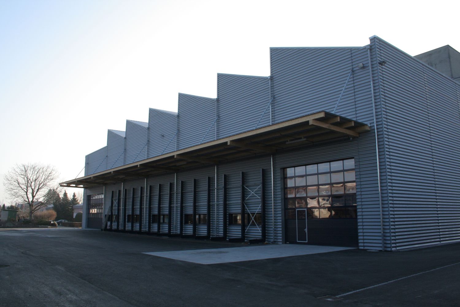 Die neue Produktionshalle in Oberriet mit den Aussenmassen 50 x 23 x 12 Metern wurde in einer Holz-Stahl-Mischbauweise erstellt. Die über 22.5 Meter gespannten Holzfachwerke sind auf Stahlstützen abgestellt.