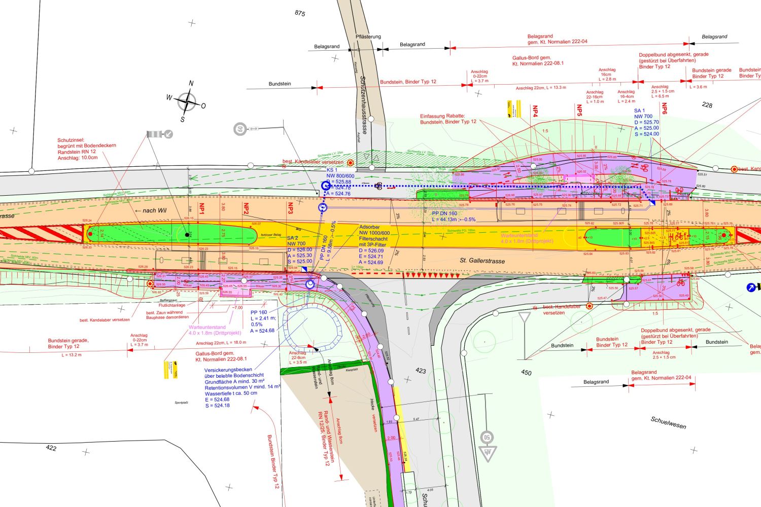 Die Bushaltestelle Nord wurde in einen bestehenden Geh- und Ragweg integriert, damit eine konflikfreie Nutzung möglich ist. Die beiden Haltekanten liegen im Einmündungsbereich von zwei Strassen. Sehr anspruchsvolle Höhenverhältnisse (minmalste Gefälle).