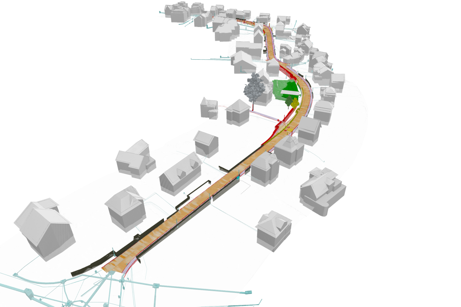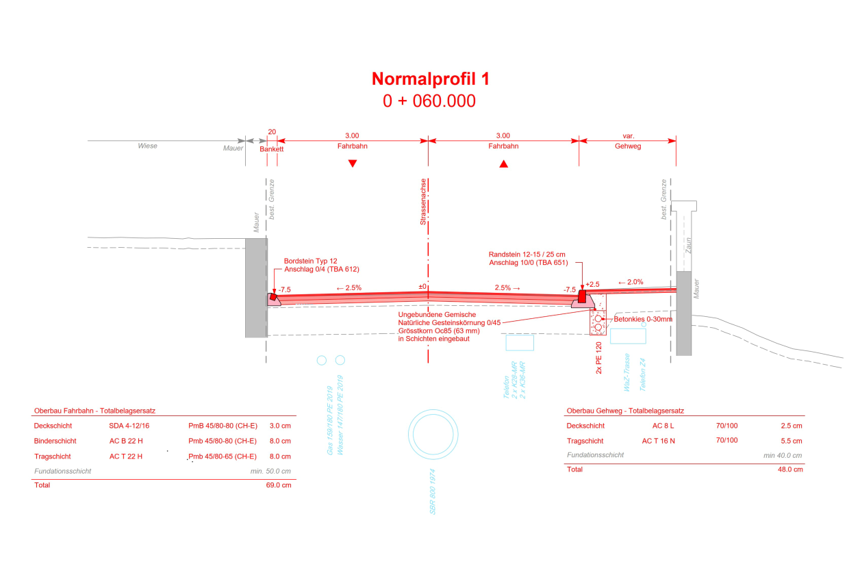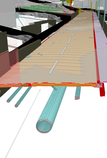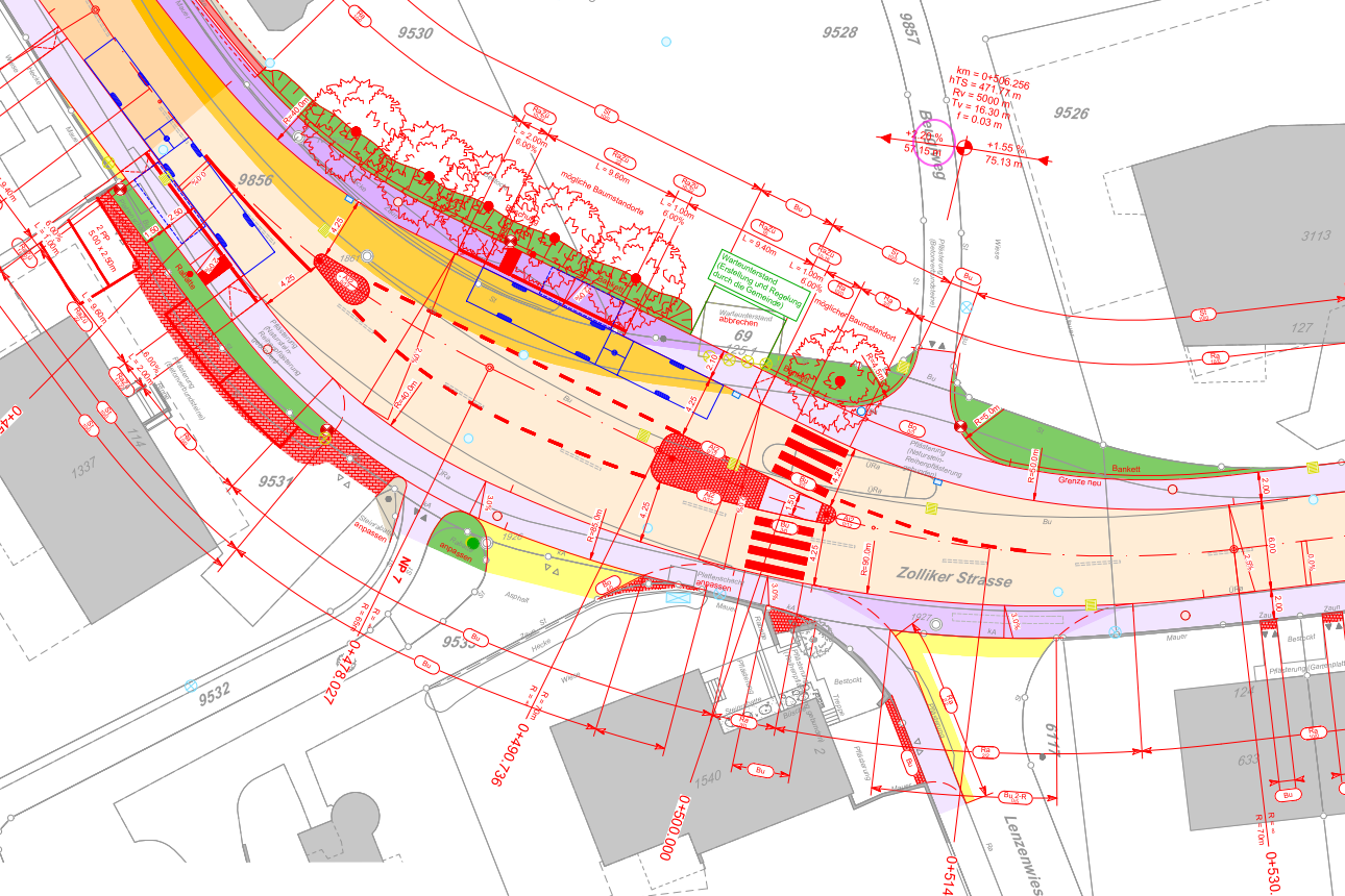 Um die Digitalisierung im Strassenbau voranzutreiben, setzt das Tiefbauamt des Kantons Zürich in diesem Projekt auf die BIM-Methode. Bereits in der ersten Phase wurde ein umfassendes digitales Bestandsmodell des Projektperimeters erstellt, das sämtliche Oberflächen, Gebäude, Werkleitungen und den Strassenoberbau umfasst. Im Vorprojekt (BIM-Phase 1A) wurde das Projekt in 3D aufbereitet und mit den notwendigen Informationen ergänzt. Im Rahmen der mit der Erarbeitung des Bauprojektes wurde die BIM-Phase 2B bearbeitet.
