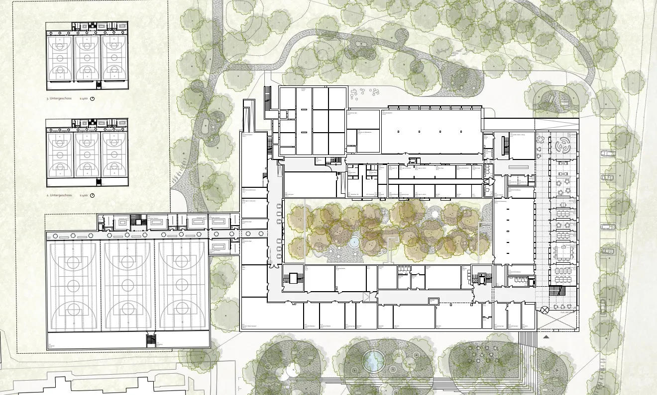 Erweiterung Berufsbildungszentrum mit fünf Turnhallen und siebengeschossigem Schultrakt in nachhaltiger Bauweise