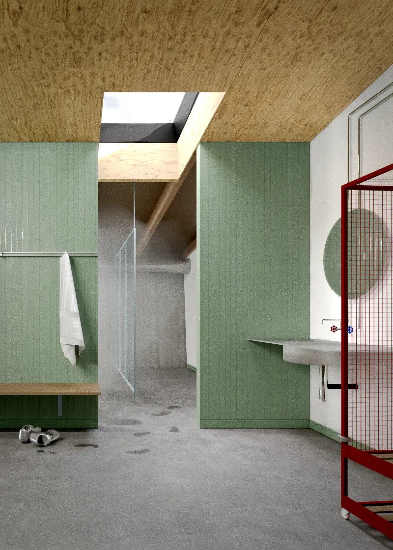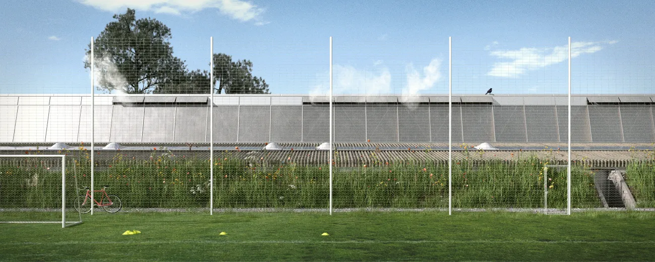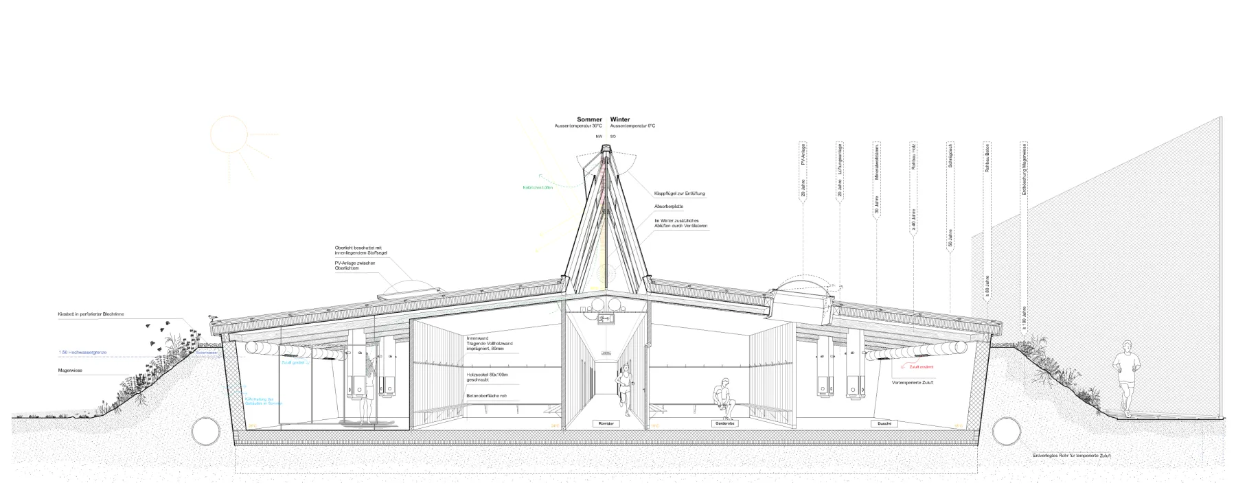 Garderobengebäude mit Böschungen aus Aushubmaterial