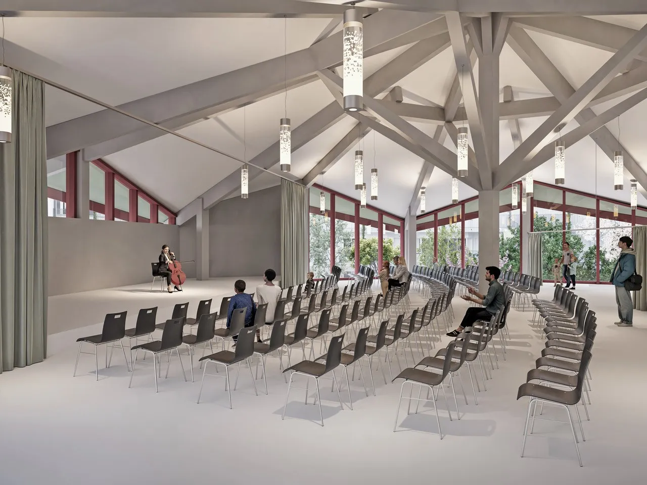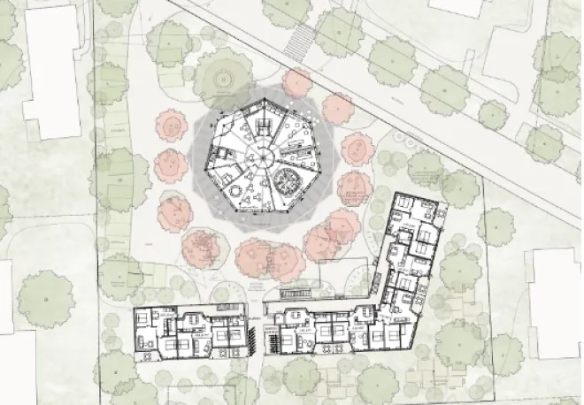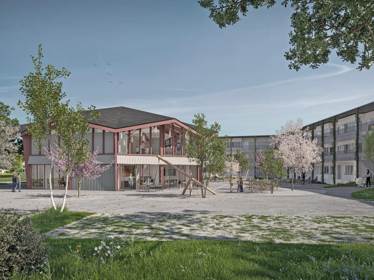 Neubau zweigeschossiges Quartierzentrum und dreigeschossiger Wohnbau in nachhaltiger Holzbauweise