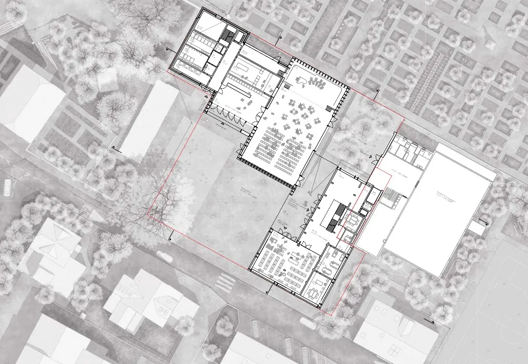 Neubau Schulhaus, Gemeindesaal mit Bühne, Pfarreisaal